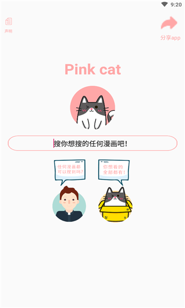 喵喵番是一款超级好用的漫画app目前市面上所有漫画都能搜得到