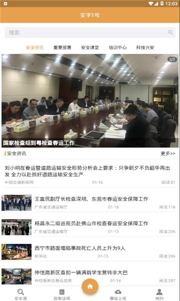 安字1号app安卓版分享给大家,这是一款全新推出的交通生产安全管理平台,软件功能丰富,你不仅能在这里及时了解最新的安全出行知识和相关新闻,还能上报事故,非常实用,欢迎下载!