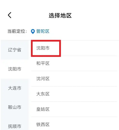 app页面,切换所属城市沈阳市。