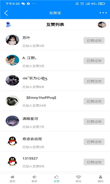 4、操作非常简单,只需要打开qq名片自动回赞后,启动辅助功能,然后再打开qq的个人页面,进入《点赞》功能,q名片自动回赞就会启动,帮你实现自动每天一个好友10次的点赞。