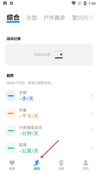 2、点击运动页面,分综合、计划等类别,当前无运动记录,展示步数、热量等运动趋势统计项。