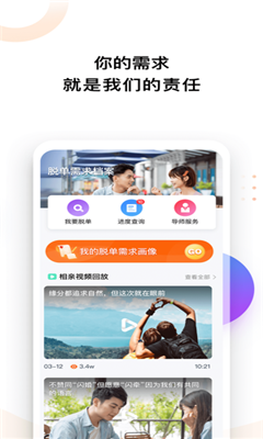 用户在“我要脱单”中详细描述自己的脱单需求,脱单管家将针对用户提交的信息,为用户匹配近似用户需求的嘉宾作为视频相亲对象。脱单管家线上一对一全程陪同用户,一站式服务到底,帮助用户提高脱单成功率。