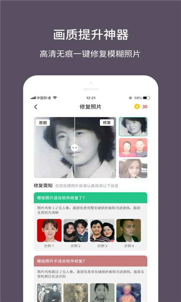 老照片修复大师一款可以帮用户对老照片进行黑白上色、照片暗淡体亮,照片去除噪点、清晰度和破损修复的实用工具。