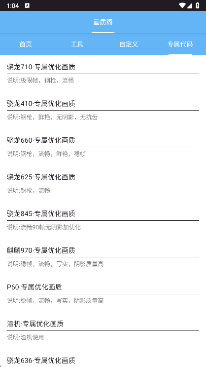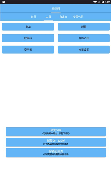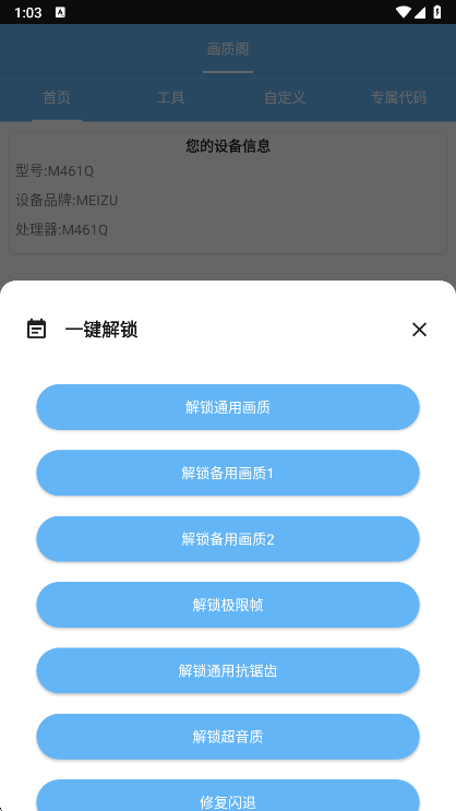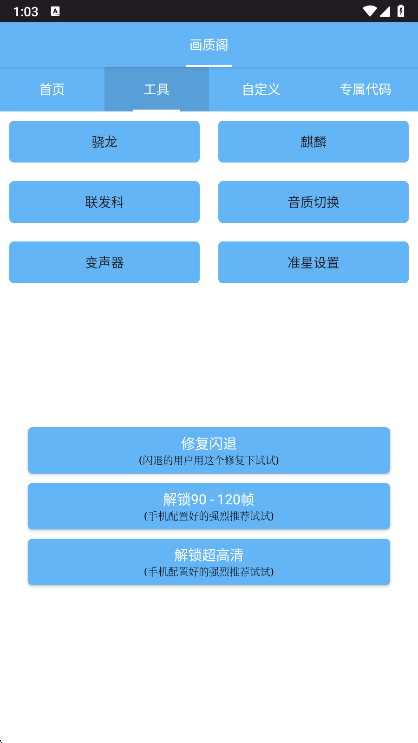 1、在本站下载安装画质阁app并打开,来到首页会对您的机型进行检测