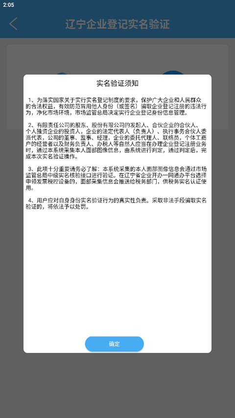 1、首先进入该软件,点击“实名验证须知”,查看完成后,点击“确定”;