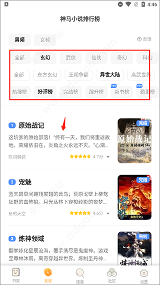 3、并选择了小说类型后还能看到软件中提供了热搜、好评、完结、飙升、新书等各种榜单