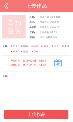 (1)上传:点击加号可以添加照片,填写以下所有内容,选择拍卖时间,结束时间。