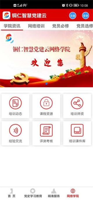 1、首先我们进入铜仁智慧党建软件,点击右上角进行登录,没有账号的朋友可以先进行注册;