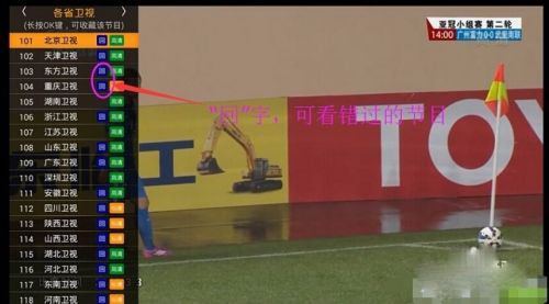 如果错过了喜欢看的节目,也可以使用直播回看!用OK键调出节目栏,找到你想回看的节目,如有回字,就可以回看所有错过的节目,此时你只需要按遥控的“返回”键,选择“菜单选项”——“回看节目”再选择你想错过的节目就能回看了。(HDP直播可回看一周之类的节目。)