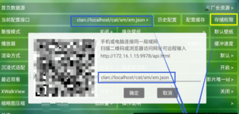 3、打开猫隐视TV,设置-点击存储权限开启权限-当前接口-粘贴接口。完成后,返回首页就可以愉快的使用了。