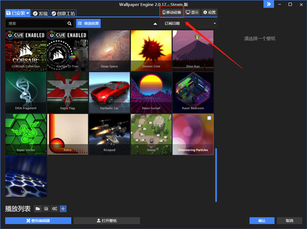 1、在 Windows 上的 Wallpaper Engine 中单击新的移动设备按钮,然后选择连接新设备。