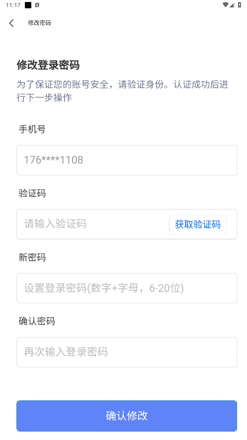 4.给你注册时绑定的手机号发送验证码验证信息后输入新密码确认,点击修改即可。