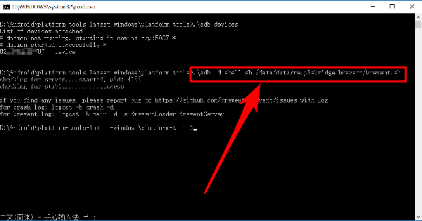 14、待我们的设备列举出来后,输入命令“.\adb -d shell sh /data/data/me.piebridge.brevent/brevent.sh”,从而完成我们对黑域手机端的授权;