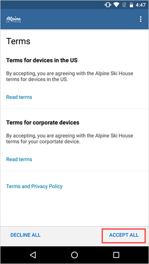 1、打开公司门户应用并使用工作或学校帐户登录,如果系统提示你接受组织的条款和条件,请点击“ 全部接受”。