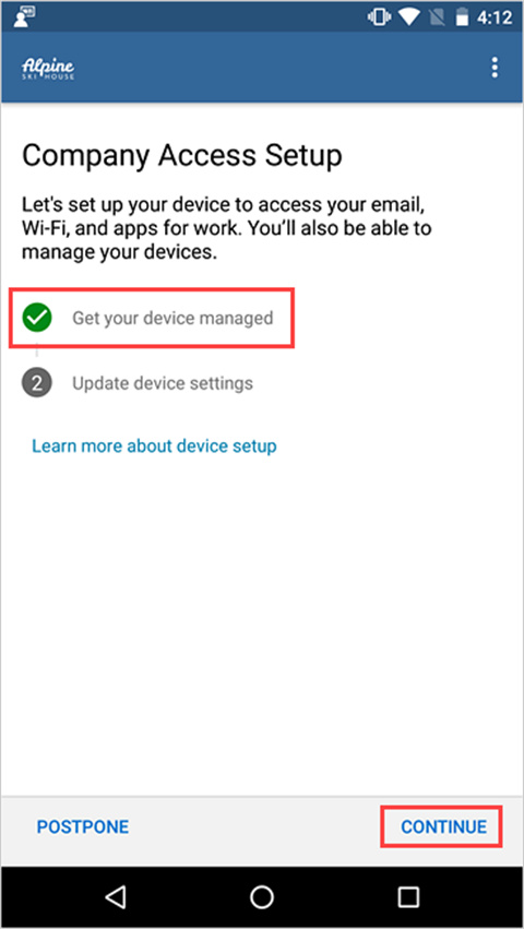 7、在“ 公司访问设置” 屏幕上,检查设备是否已注册。 然后点击“ 继续”。