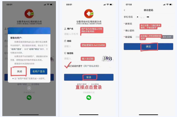 打开“金农信e付”app,点击“关闭”关闭老用户登录弹窗。在“用户名”栏输入办理收单业务时留存的手机号码及初始密码,输入页面显示验证码,点击“登录”。登录后选择目前在用门店(以在用码牌门店名为准),进入修改密码界面,修改完成点击“确定”返回登录即可。
