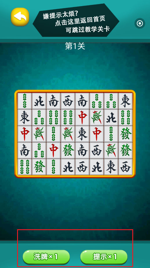 4、然后来到第一关。下方有洗牌和提示两个按钮。可以进行相关游戏操作,