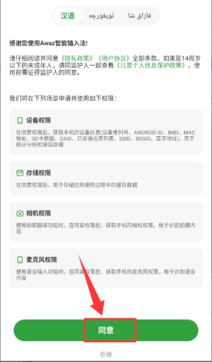 1、在权限说明窗口点击"同意",即可进入输入法应用。