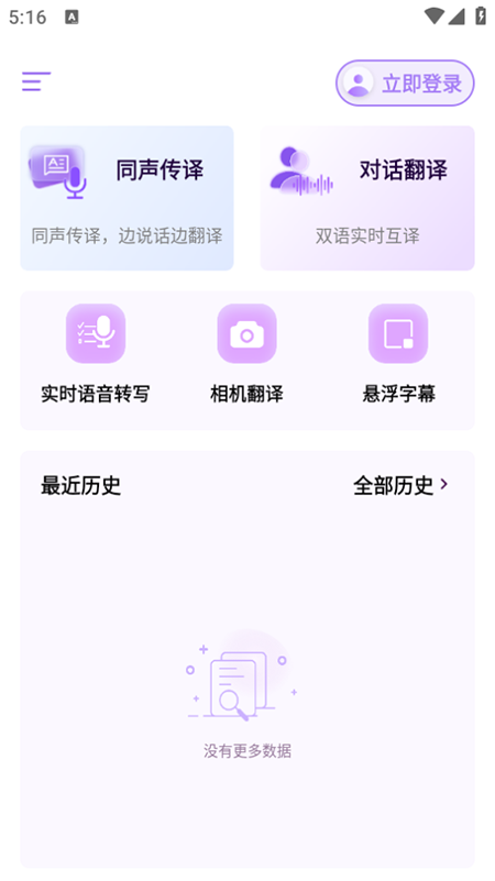 1、在本站内下载与安装并打开软件,在软件内有同声传译、对话翻译、实时语音转写、相机翻译、悬浮字幕等功能。