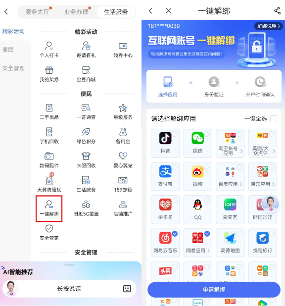 Step 1:进入中国电信App-查询办理频道全部-生活服务-便民-一键绑定,选择需要解绑的应用。