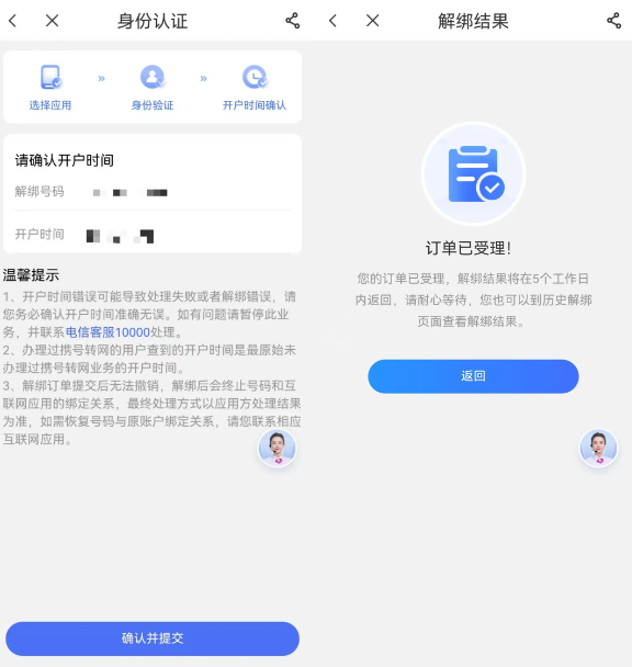 Step 3:确认开户时间后提交!解绑结果将在5个工作日内返回,也可以到“历史解绑”页面查看解绑结果。
