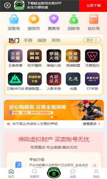 蛙宝代售是一款专注于游戏账号交易的移动应用,为游戏玩家提供安全、高效、便捷的账号买卖平台。