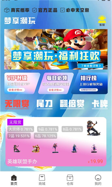 梦享潮玩app是一款以潮玩商品为主,同时提供了盲盒,无限赏,卡牌,手办等一系列商品的娱乐平台,这里不止有多样化的盲盒可以选取,同时还有不定时的福利活动可以参与,让用户参与开盒的乐趣。