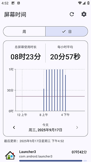 Screen Time是一款实用的工具,特别适合想要管理手机使用时间的用户。它不仅提供了详细的数据统计和友好的操作界面,而且完全没有广告和联网限制,让使用体验更加流畅。通过这个应用,你可以更清晰地认识自己的使用习惯,从而提升手机使用的效率和健康度。3、点上方可以切换周或者日,查看详细内容。
