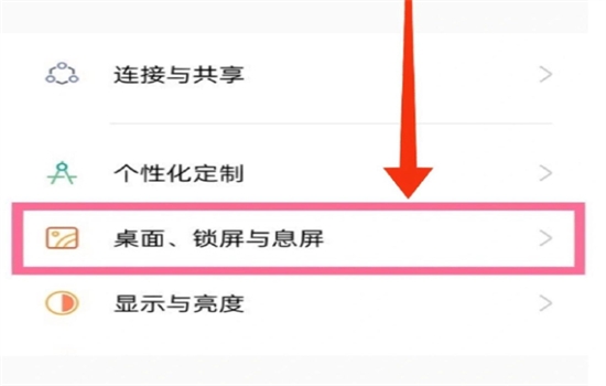 1、首先打开手机设置,点击【桌面、锁屏与息屏】选项。