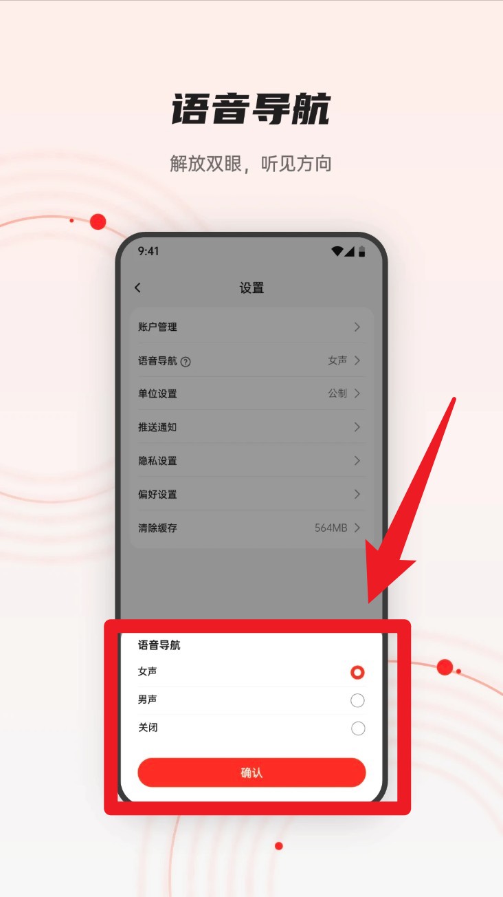 5. 若需启用语音导航功能,可前往「设置」页面找到语音导航选项,自由切换男女声或关闭,确认后即会在骑行时实时语音提示路线。