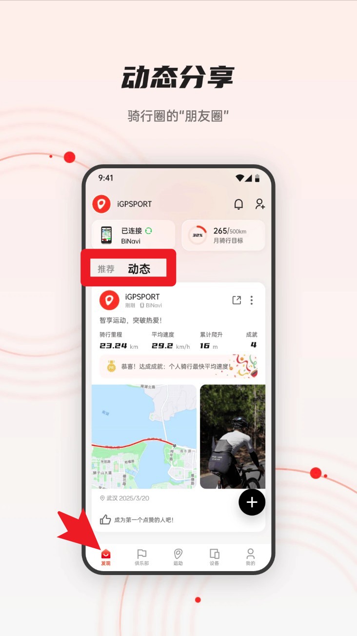 2. 登录成功后进入首页,点击底部导航栏「发现」,可进入骑行动态区,浏览他人发布的路线、打卡图文内容,互动评论同步更新。