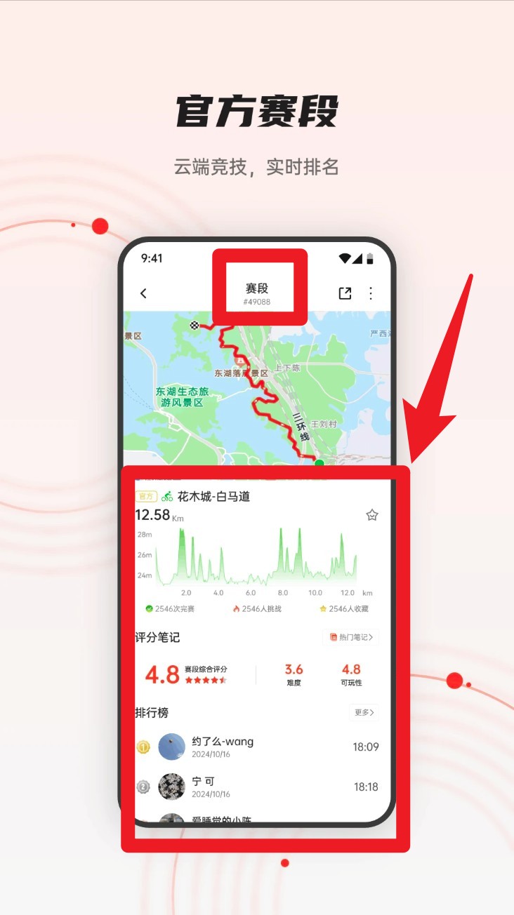 3. 在「官方赛段」模块中查看平台举办的云端骑行挑战,点击赛段地图进入后可查看路线数据与排行榜,支持实时上传成绩参与排名。