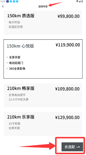 2、在车型页面选择具体的配置,点击去选配。