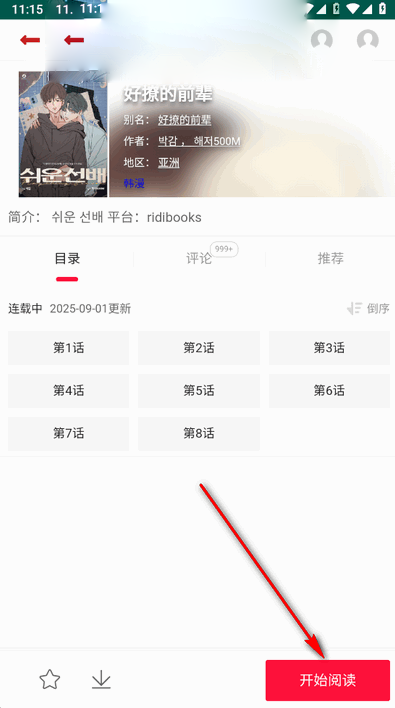 2、进入漫画详情页后,直接点击“开始阅读”按钮,系统将加载最新章节内容。