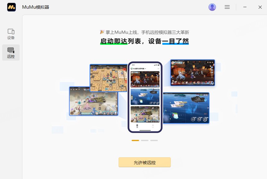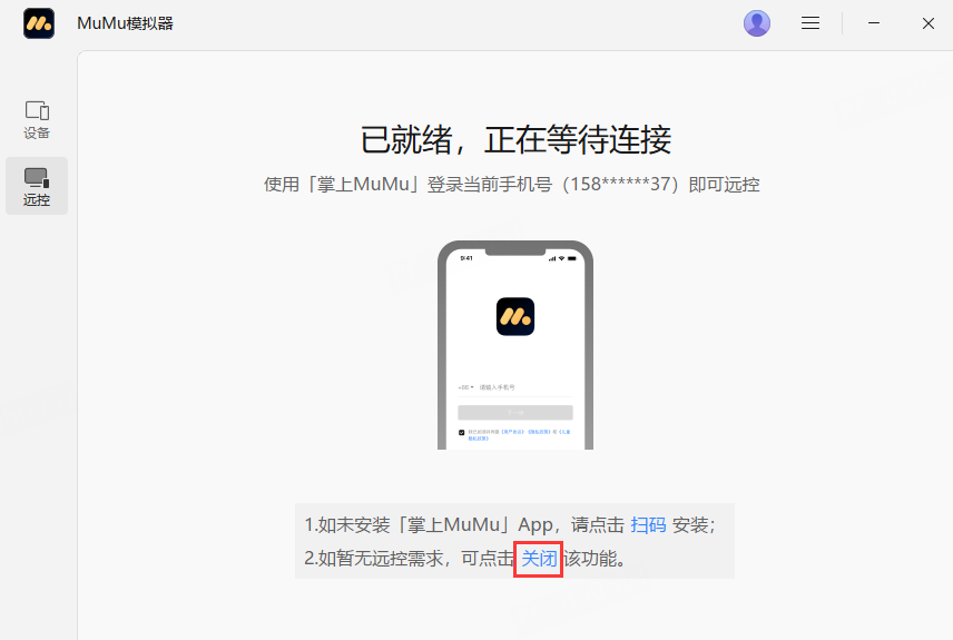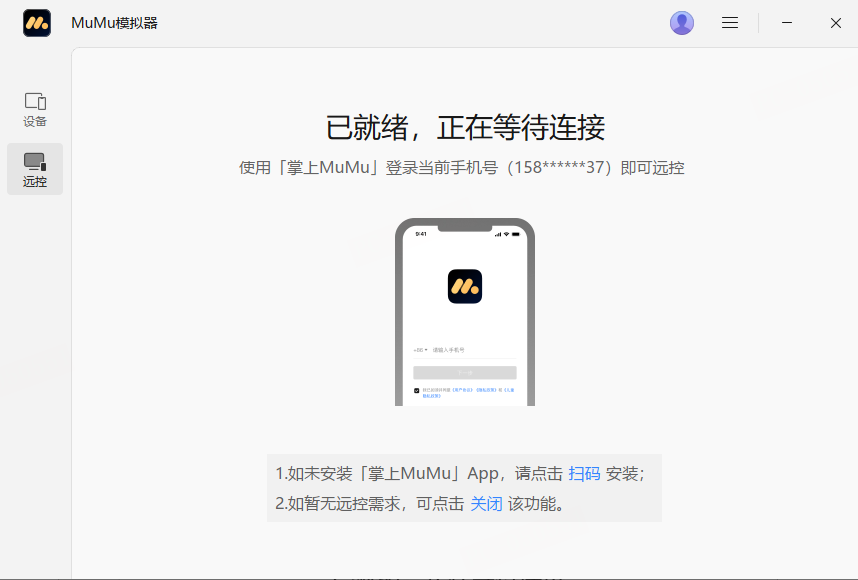 请注意,登录电脑端MuMu模拟器的账号需与移动端掌上MuMu 登录的账号一致,才可在“允许被远控”后进入就绪状态。