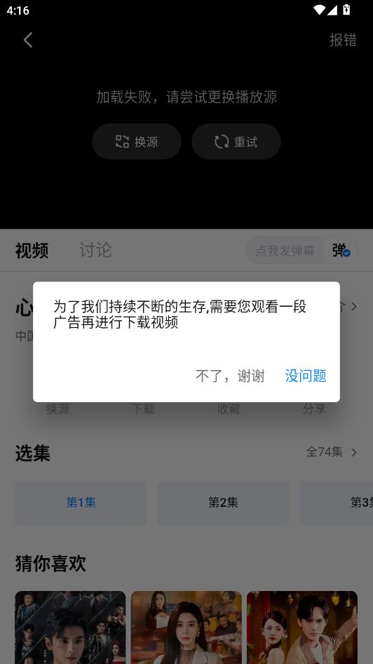 会弹出上图提示框,点击没问题,观看片刻即可下载缓存了。