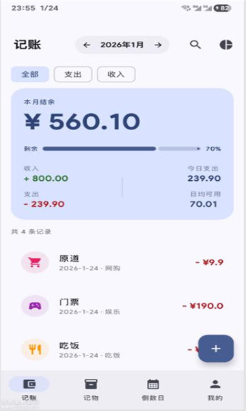 在底部导航栏切换“记账”“记物”“倒数日”三大模块;