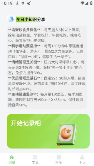 2、进入首页可以看到丰富的功能,点击右下方的【开始记录吧】可以创建笔记。