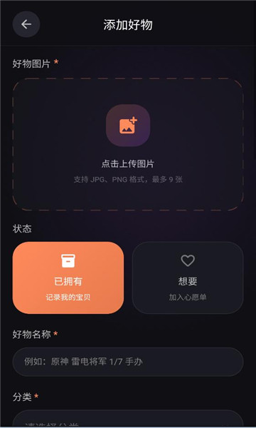 分类与状态标记:通过分类、标签和状态区分已拥有、心愿、在途等收藏情况,方便查看与整理;