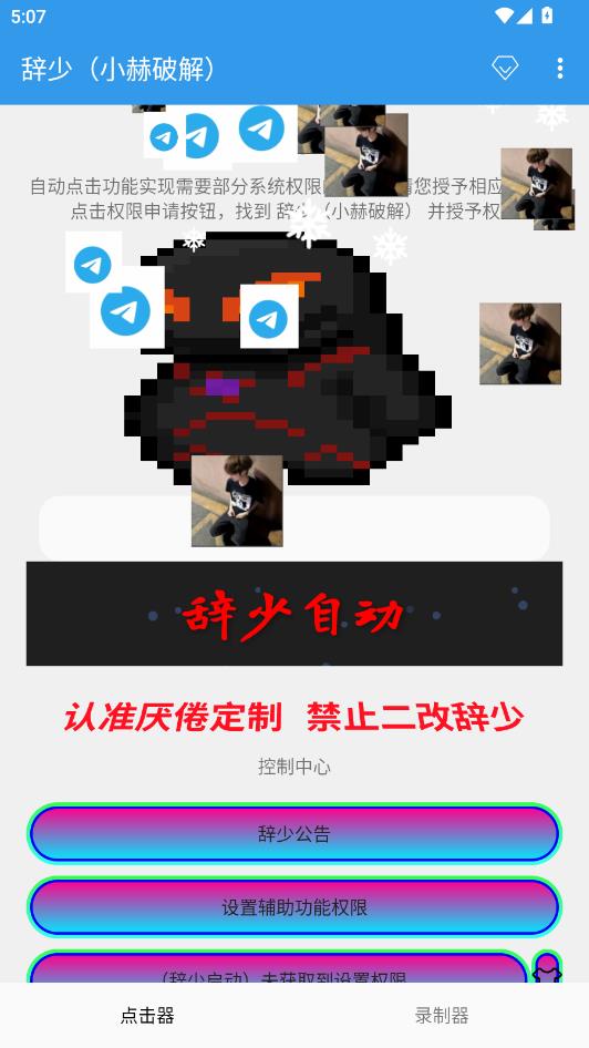 辞少小赫破解app是款自动化连点操作工具,可以通过脚本的方式实现频繁重复操作功能,能够节省大量的时间和精力,并且支持多种模式录制,包括点击、滑动等,还能调节详细的参数,让其更加符合使用需求。