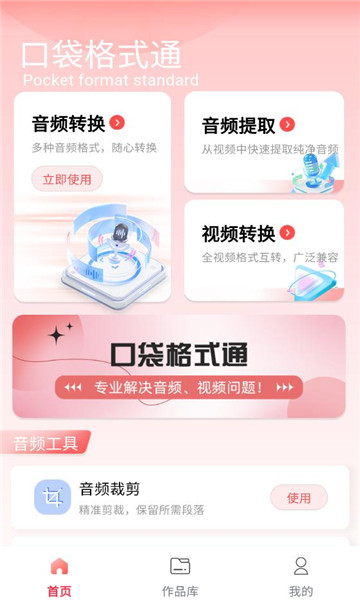 口袋格式通app是一款可以解决音视频格式问题的手机软件,除了音视频格式转换,还可以进行音视频文件提取,支持的格式齐全,让你可以进行一键提取,转换,兼容性也是比较好的,欢迎前来使用。