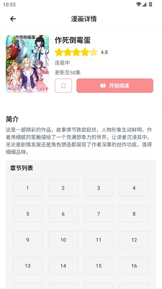 找到喜欢的进入详情页面,选择章节即可进入阅读。
