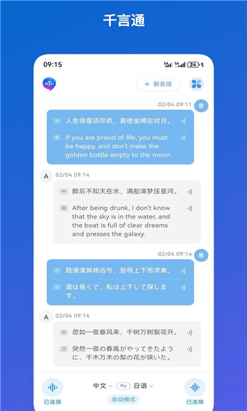 千言通app是一款主要用于商务远程会议的同声传译软件,让用户可以轻松进行跨境交流,翻译更加及时,准确,采用了主机和麦克风分体的设计方式,不止延迟低,而且易操作,欢迎前来使用。