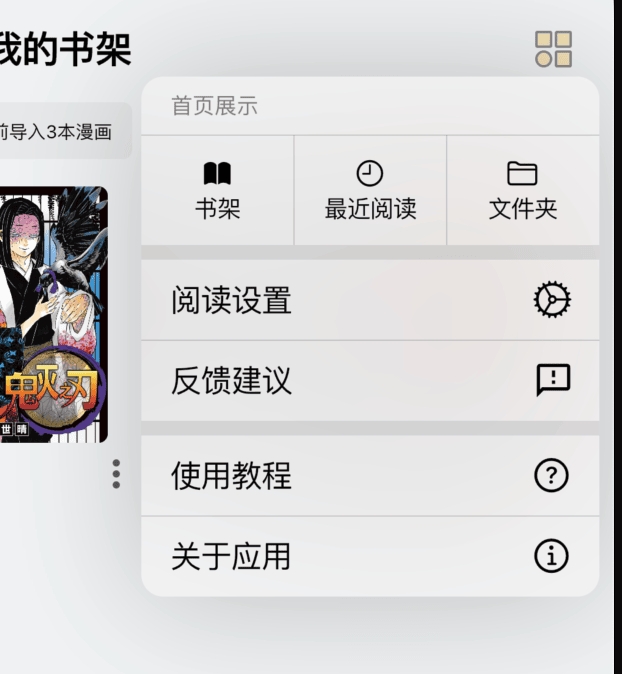 首页展示可以切换首页显示书架、最近阅读、文件夹三个模块