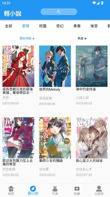 6.点击下方的轻小说板块,可以看到上方会有分类超级详细的小说类别,比如爱情、校园、奇幻、青春等,大家可以按需点击使用哈。