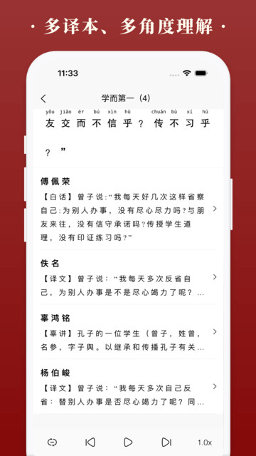 1. 具备语音朗读功能,方便用户随时听读论语,营造沉浸式学习氛围,无论何时何地,都能开启学习之旅,加深对经典的理解。