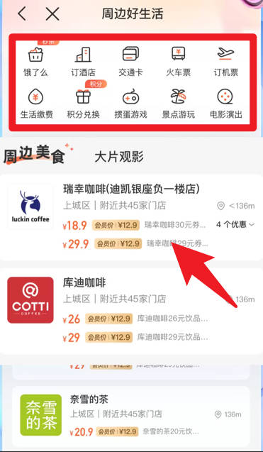4、周边好生活页面涵盖美食、酒店、交通卡、票务、生活缴费及积分兑换等服务,方便用户在本地享受吃喝玩乐与便民生活。