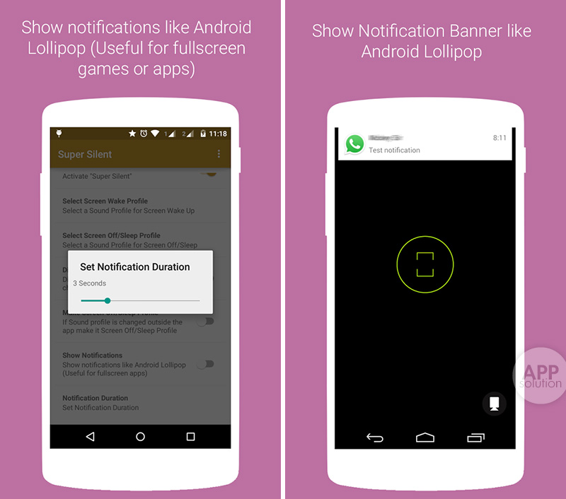 另外,Super Silent 还有一个为低版本 Android 手机准备的小功能——以 Lollipop 样式显示通知。这意味着你可以在运行全屏应用时正常获取通知,而不必中断当前的操作。