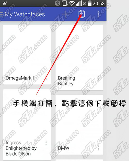 5、在手机上打开watchmaker应用,点击右上角箭头