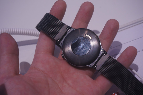 再看机身背面,大致和市面上多数智能手表一样,设置了一个心率和血压监测仪。因为是无线充电,所以在背面还有几个充电需要用到的触点。
